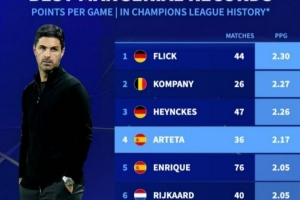 欧冠历史主帅场均积分榜:弗里克居首,孔帕尼次席,阿尔特塔第四