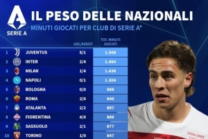 意甲各队球员国际比赛日出场时间榜:尤文居首,国米、米兰二三位